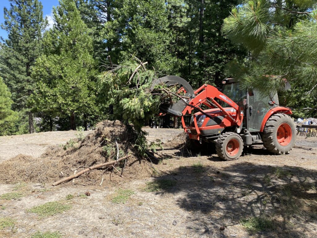 - A 50+ horsepower Kioti cab tractor/loader with bucket, box scraper, auger (post holes), masticator/mower (brush, grass, manzanita, sage, etc.), snow plow, pallet forks, needle rake, grapple, and more